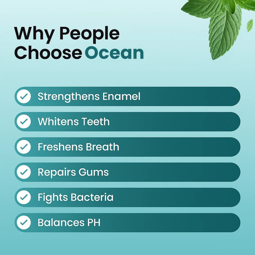 Most gums just cover up bad breath — Ocean™ actually improves your oral health. With every chew, it boosts saliva production, fights bacteria, strengthens enamel, and gently removes surface stains — all without harsh chemicals, bleach, or toothpaste.